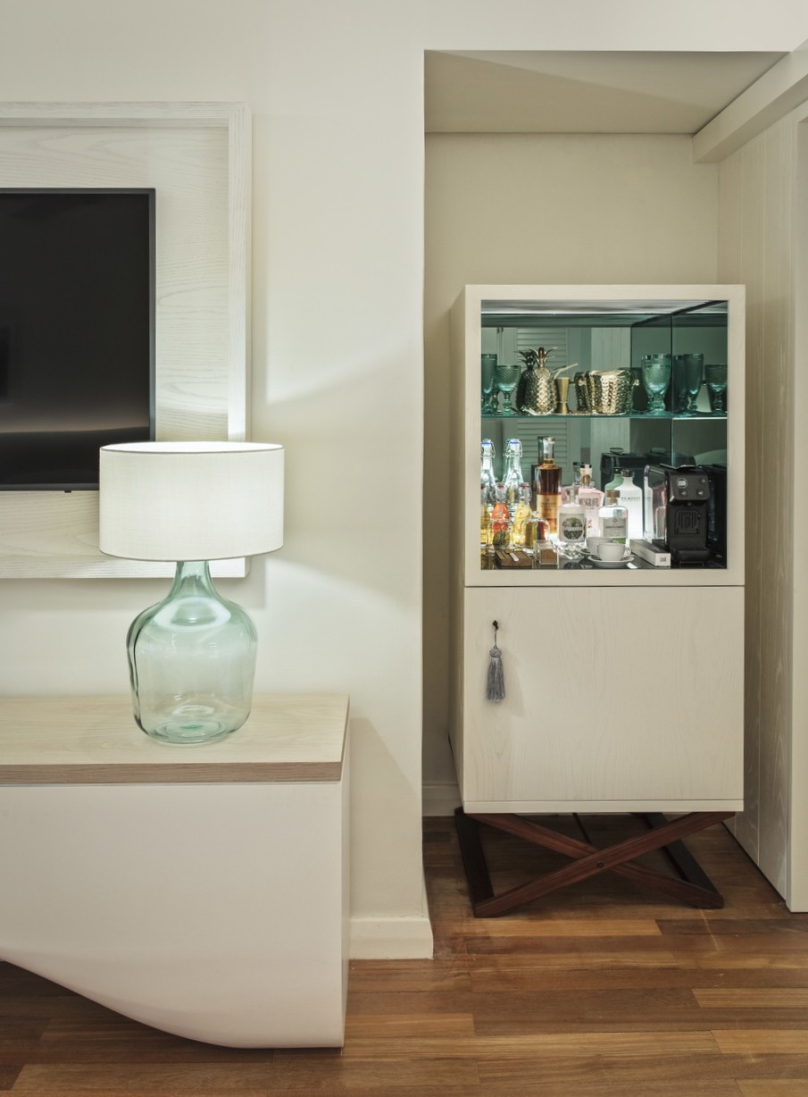 Additionally, the room includes the guest’s own mini tropical bar: an emerald mirror-lined cabinet accessorized with a gilded cocktail kit and cut-glass tumblers, allowing guests to prepare and enjoy drinks in the comfort of their room. This bar highlights the hotel’s collection of crafted drink mixers along with a personalized selection of liquors and snacks.